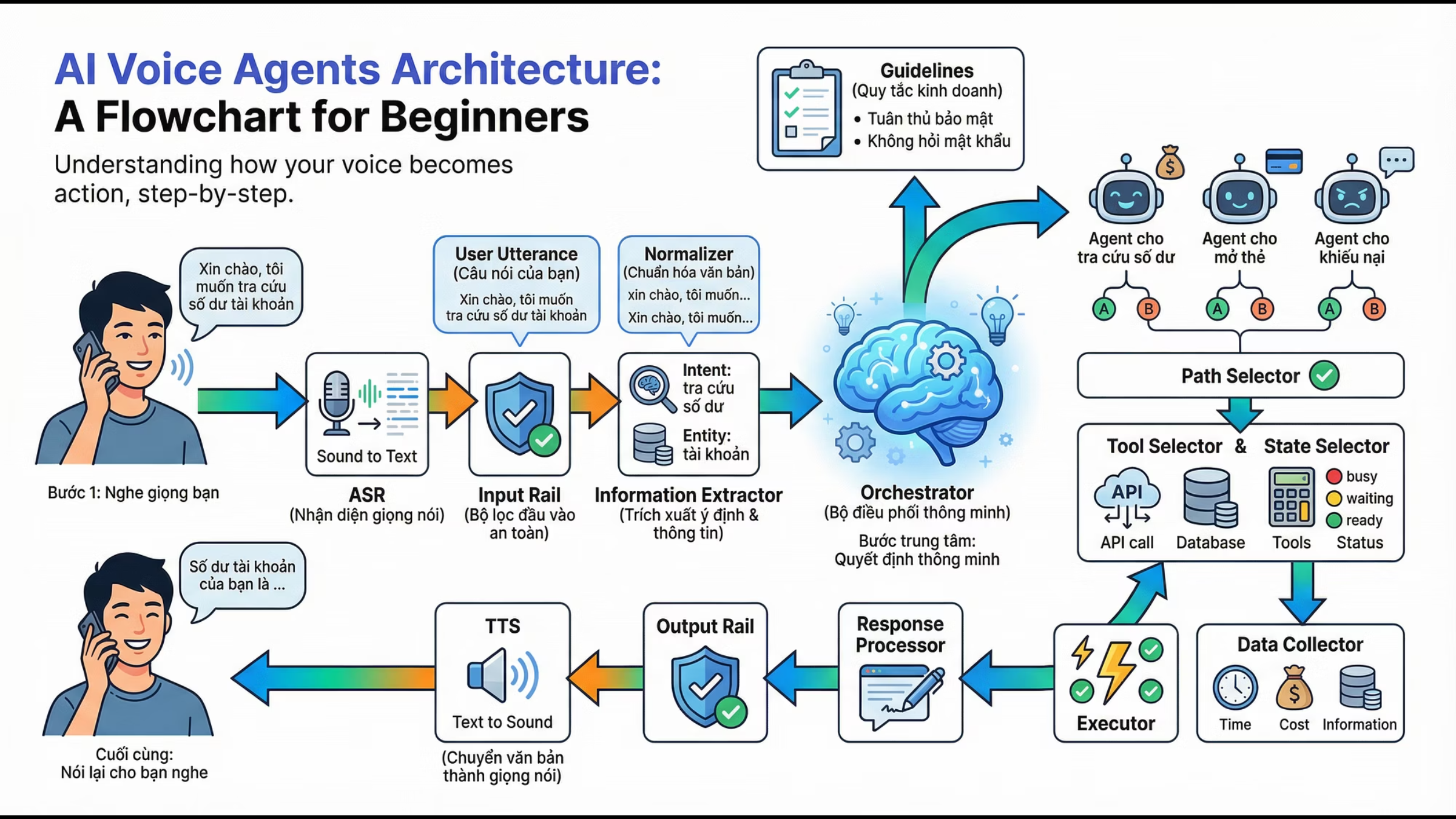 Bài viết này sẽ giải thích toàn bộ flow hoạt động của một AI Voice Agent — dùng ngôn ngữ siêu dễ hiểu, kèm hình minh họa. Dù bạn là người mới học AI, Data, hay Backend — đều có thể nắm được!