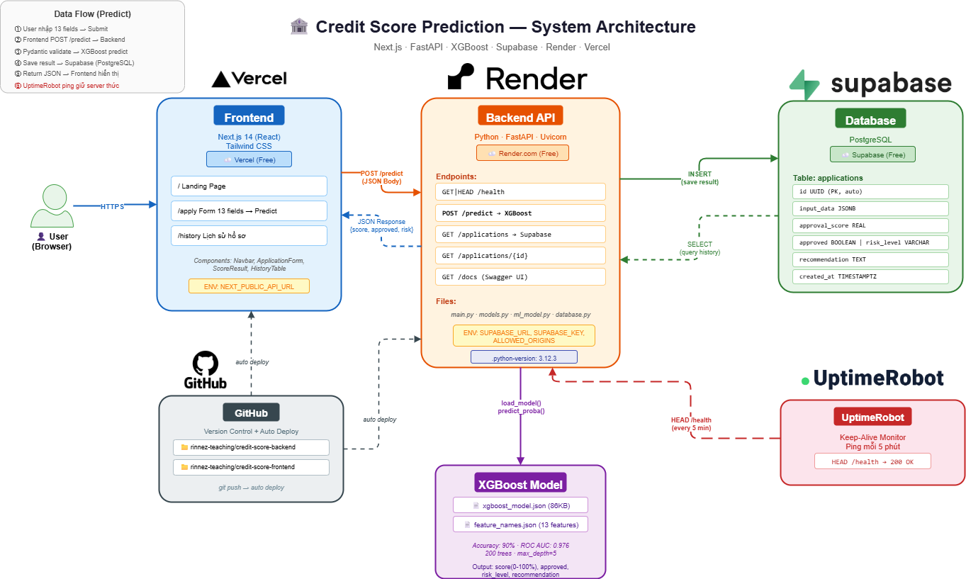 Một ứng dụng fullstack thực thụ dự đoán điểm tín dụng — từ frontend, backend API, database đến ML model — tất cả deploy riêng biệt trên cloud, $0 chi phí hosting.